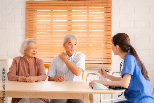 Happy Senior Asian Woman Receives Medical Care at Home, Doctor or Caregiver Nurse Provide Support Assistance, Enhancing Healthcare Services for Elderly Patients Retirement