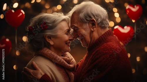 Happy Senior Couple in Love with Red Heart Balloons – Romantic Valentine's Day, women's Day, wedding anniversary. A mature couple husband and wife are happy spending time together.