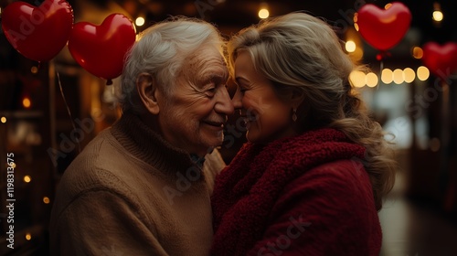 Happy Senior Couple in Love with Red Heart Balloons – Romantic Valentine's Day, women's Day, wedding anniversary. A mature couple husband and wife are happy spending time together.