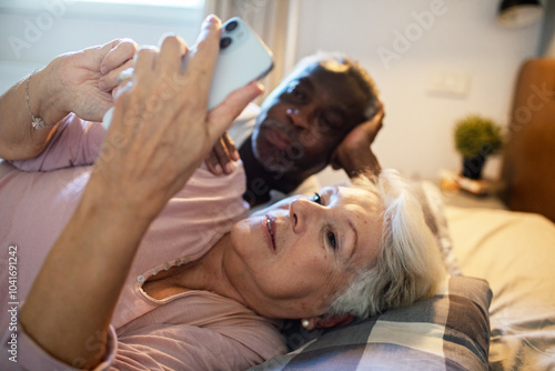 Happy senior couple relaxing in bed at morning