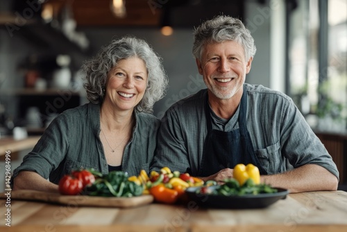 Happy senior couple smiling in their kitchen with fresh vegetables, showcasing healthy eating and a joyful lifestyle.