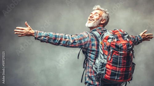 Happy Senior Man Embracing Adventure with Backpack Outdoors