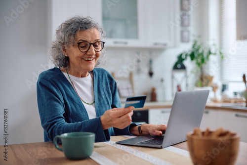Happy senior woman ordering online with credit card and laptop.