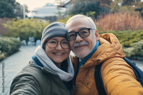 Happy seniors enjoying a sunny day outdoors, smiling and taking a selfie together in a beautiful park.