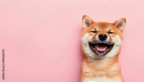 Happy shiba inu dog smiling in cheerful photography shot on soft background with copy space