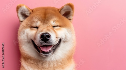 Happy shiba inu dog with bright expression on soft colored background, ideal for text placement