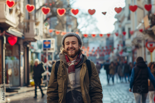 Happy Single Man Celebrating Self-Love and Freedom on Valentine's Day Amidst Romantic Street Decorations
