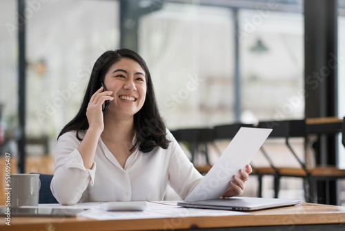 Happy smiling asian business woman working on laptop at office, using smart phone. Businesswoman sitting at her working place