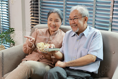 Happy smiling asian senior man and woman sitting on sofa and eating popcorn while having fun with movie rest indoor at home living room. Couple elder husband and wife embrace are happy while watch TV