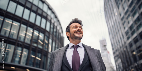 Happy smiling businessman in London city in winter. Concept of business, success and entrepreneurship.
