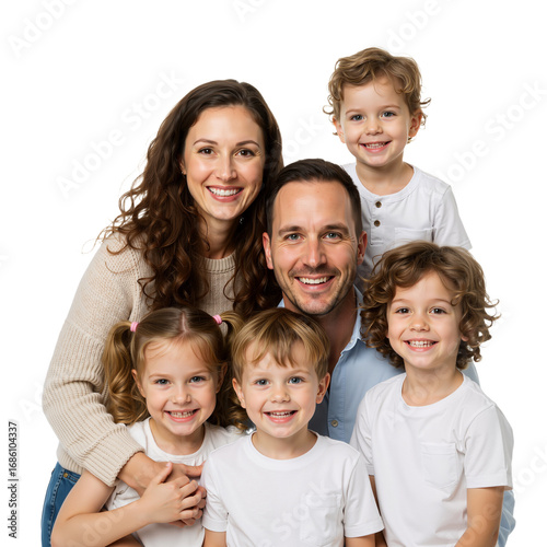 Happy, smiling family of five with parents and three young children posing together for a studio portrait