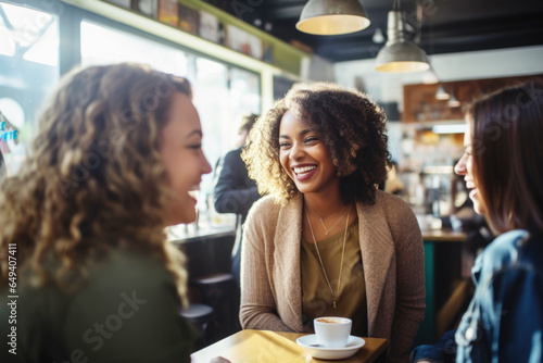 Happy smiling female friends sitting in a café laughing and talking during a lunch break