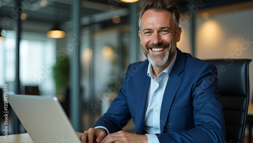 Happy smiling middle aged CEO businessman in blue suit sits at desk working on laptop in office laughing in workplace portrait concept as Smiling middle aged CEO businessman in blue suit sits at desk