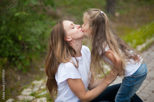 Happy smiling mother and her cute emotional little daughter child in white shirts and denim jeans are hugging and having fun outdoor in nature at countryside. Spending summer time with family.