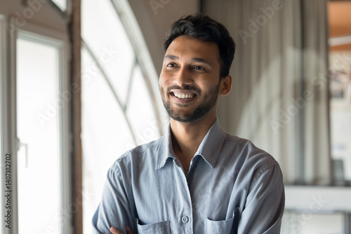 Happy smiling smart casual Indian CEO business leader standing with his arms crossed in office, looking to the side, dreaming, enjoying success, working on future new goals, business vision concept
