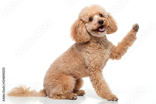 Happy Smiling Toy Poodle Sitting with Paw Raised on White Background