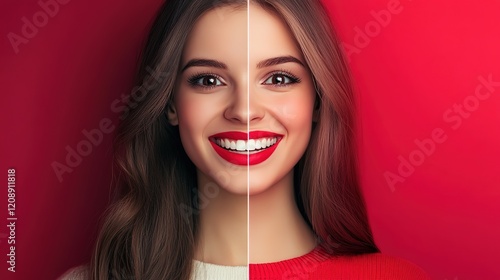happy smiling woman face expression portrait in bright tone color, two woman half face smiling with red background