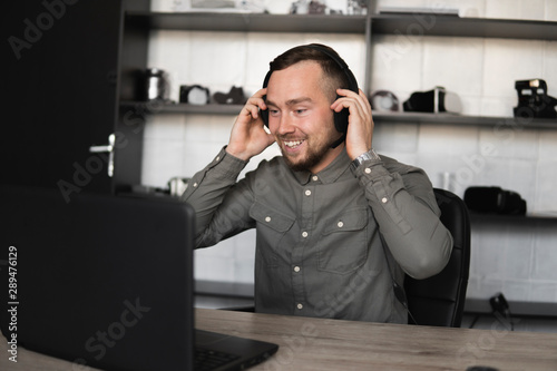 Happy smiling Young businessman or student in a shirt sitting against monitor of computer in headphones and speaking with somebody via internet. Working on a pc at a table in the office.
