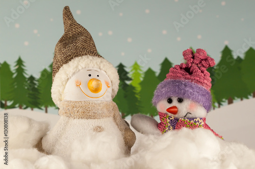 Happy snowman in winter forest.