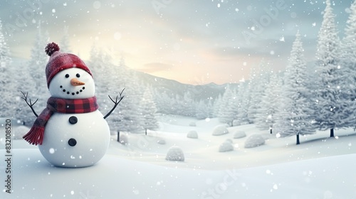 Happy snowman standing in christmas landscape. Snow background with copy space