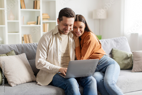 Happy spouses cozied up on couch and using laptop computer together in well-lit living room interior at home, surfing internet