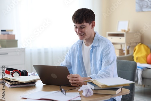 Happy student celebrating good exam result at table indoors
