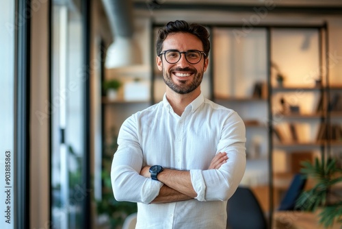 Happy successful businessman or company employee standing in office looking at camera , ai