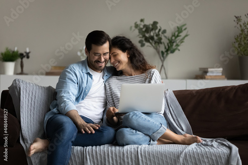 Happy sweet millennial couple sitting on sofa at home together, using online app on laptop, watching, movie, making video call, shopping and buying online, browsing internet, sharing computer