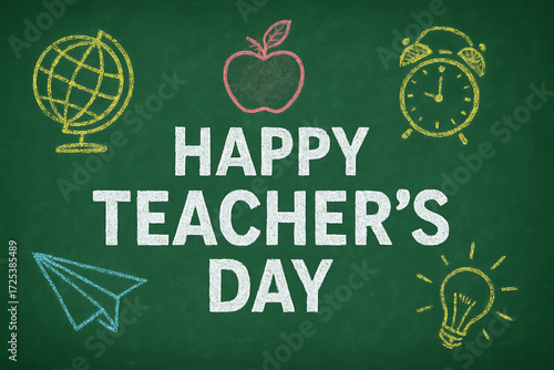Happy teacher's day text in white chalk on green blackboard with yellow and pink outlines of a globe, apple, clock, paper airplane, and light bulb