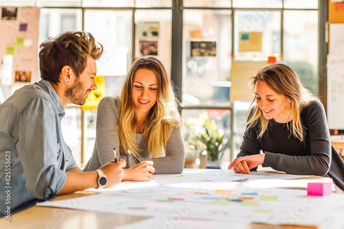 Happy team of designers brainstorming ideas in bright, modern office space.