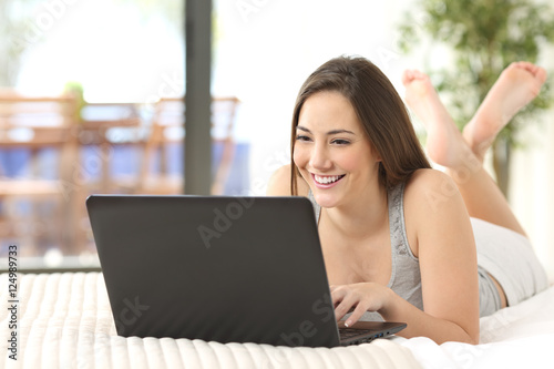 Happy teen browsing laptop online at home