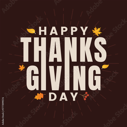 Happy Thanksgiving Day typography vector design with autumn elements on brown background. Festive logo, label, sticker, and text illustration for fall season celebration.