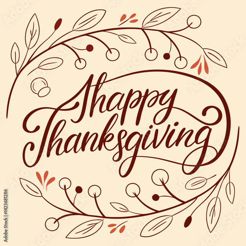 Happy Thanksgiving Floral Wreath Calligraphy Design - Brown Script Lettering - Autumn Colors.