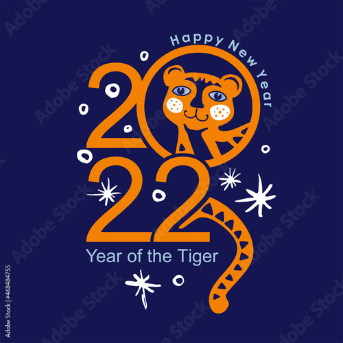 Happy Tiger and snow. 2022. Happy New Year. Vector bright card.