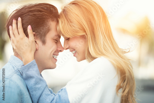Happy to spending time together. Young beautiful couple outdoor fashion portrait. Attractive boy and girl hugging and kissing.