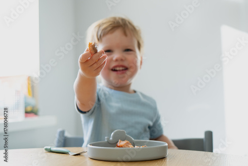 Happy toddler sitting at dining table holding piece of food and smiling representing healthy eating habits, family mealtime, and joy of childhood nutrition