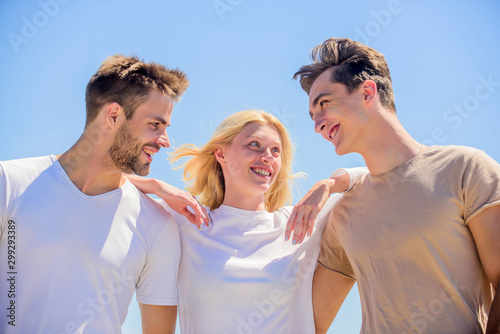 Happy together. cheerful friends. friendship relations. family bonding and love. summer vacation. time to relax. group of people outdoor. heaven concept. success heights. happy woman and two men