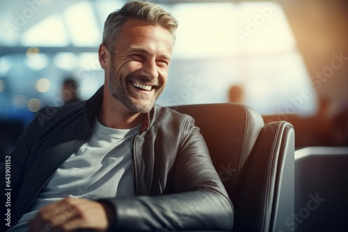 Happy Tourist Smiling at Airport Terminal, Joyful Man Waits for Flight in a Boarding Lounge of Airline Hub.