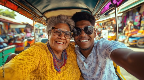 Happy tourists taking selfie while visiting Thailand on a tuk tuk, enjoying holidays and making memories together