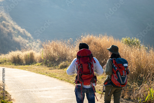 Happy Travelers Hiking with Backpacks on the Beautiful Rocky Trail at Warm Sunny. Hikers with backpacks walks in mountains. travel in the mountains with backpacks. Travel in the mountain with backpack