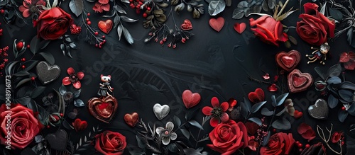 Happy Valentine s Day featuring a black background adorned with roses hearts and small dolls in love. with copy space image. Place for adding text or design