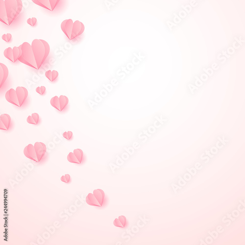 Happy Valentine's day background with paper cut pink hearts flying. Vector.
