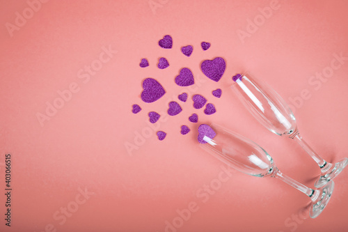 Happy Valentine's Day flatlay. Top view bottle of rose champagne in gift box, hearts, glasses on yellow color of the year 2021 background. Valentine day or New Year greeting card