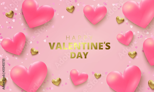Happy Valentines Day greeting card. Realistic 3d hearts on pink background. Love and wedding. Vector illustration