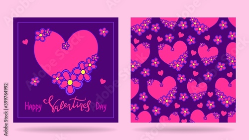 Happy Valentine's day. Set of templates. Greeting card and seamless pattern. Vector illustration.