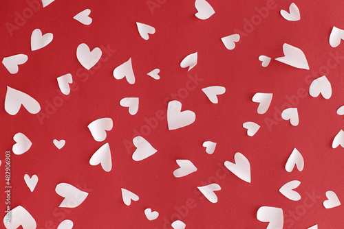 Happy Valentine's Day! Stylish hearts composition on red background flat lay. Valentines day card. Cute little white hearts cut outs on red paper. Love concept