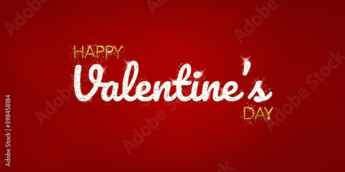 Happy Valentine’s day. Text with white and golden glitter letters on a red background. Congratulations for February 14.