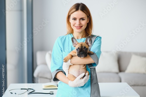 Happy veterinarian doctor hugs puppy in vet clinic. Empty space for text