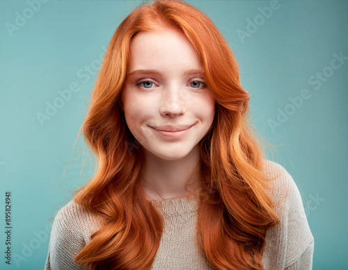 Happy vivacious young redhead woman smiling cute girl on blue background