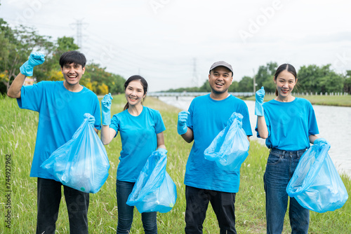 Happy volunteer people group charity with garbage bags cleaning up in park. Corporate social responsibility and society activity for Environment . Ecology and CSR concept.